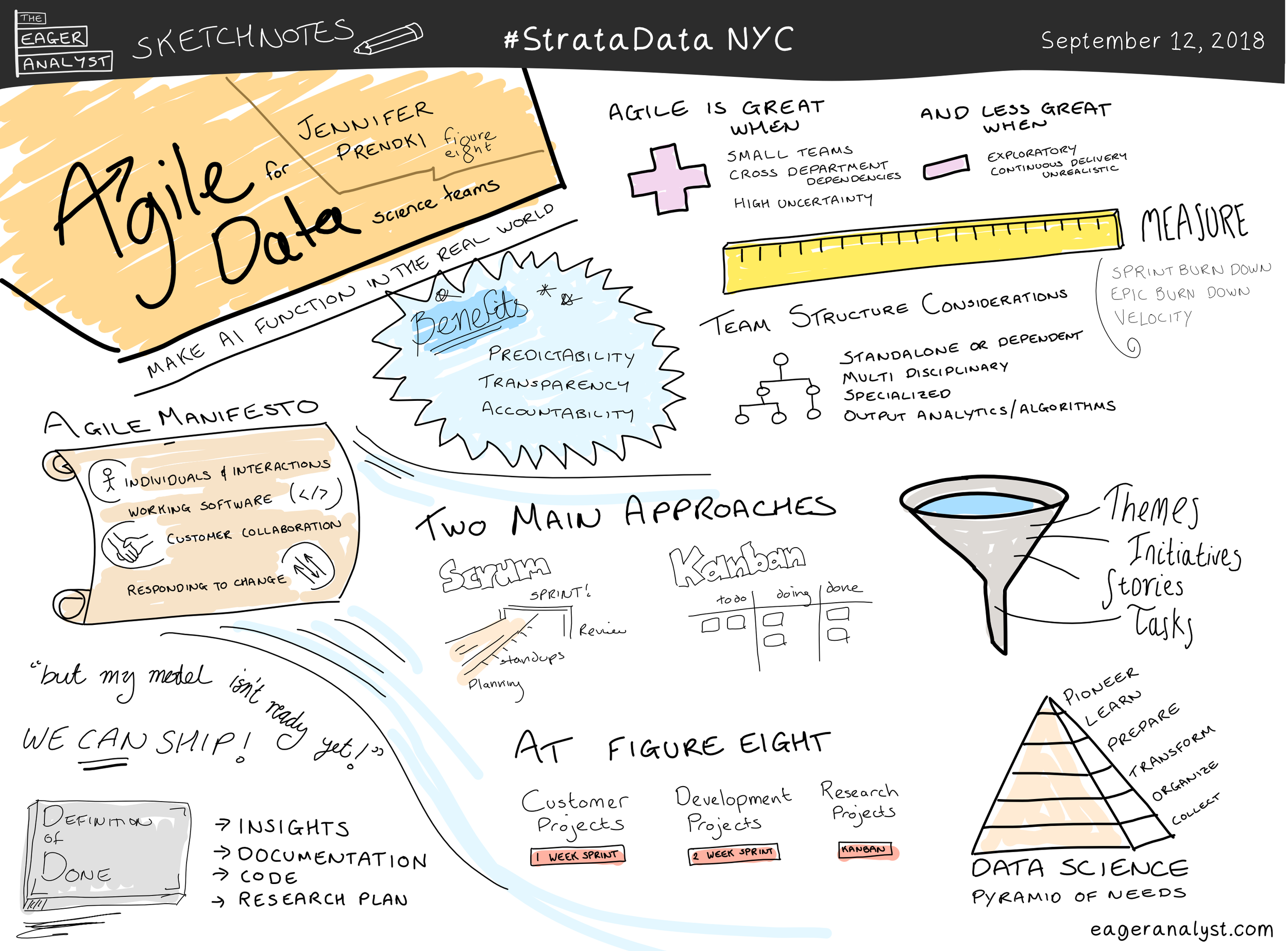 The second sketch-note is for Jennifer Prendki’s (@jlprendki) talk Agile for Data Science Teams where she talked about how Figure Eight were applying agile practices in their data science teams. It was super useful to hear how other data teams are using Sprint and Kanban for different types of projects.