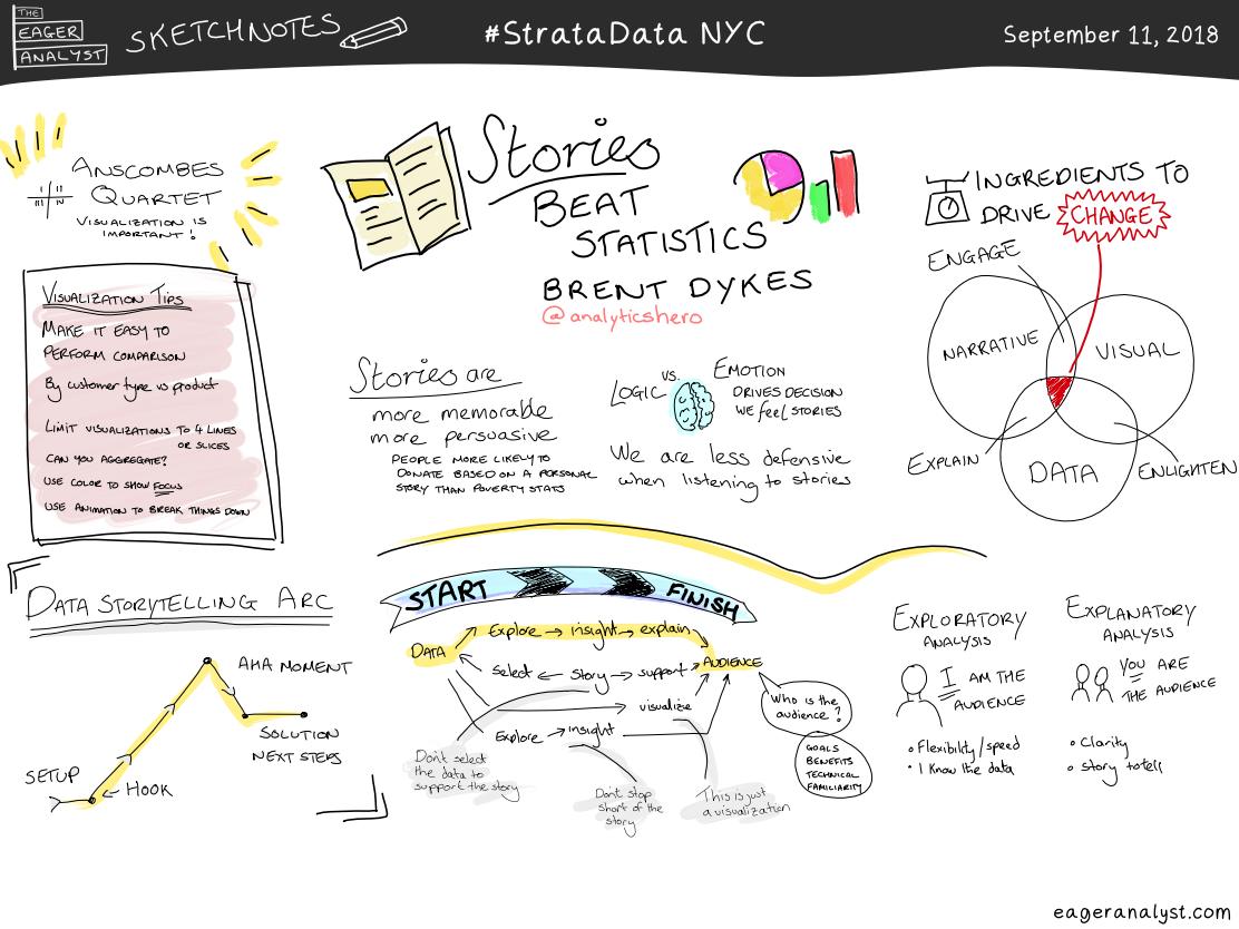 The first sketch-note is for Brent Dykes (@analyticshero) talk Stories Beat Statistics where he shared the idea that by combining data and visuals with a narrative we can more successfully deliver key messages and influence change.